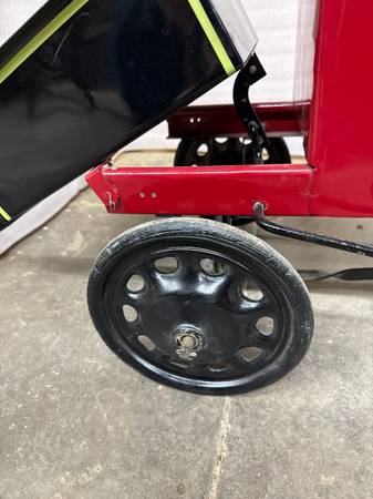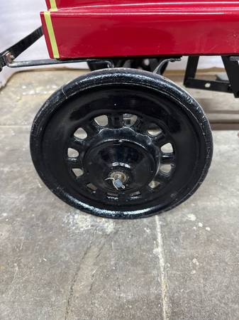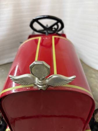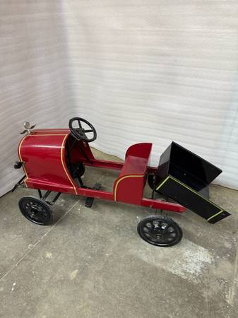 1930’s American Pedal Car Dump Truck Red with yellow pinstripes Measures: 44” Length x 19” wide (wheel to wheel) X 24” High