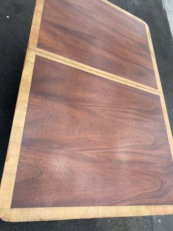 I stripped off the old finish, sanded it down to 320 grit and stained its centers a Red Mahogany. The outer band a Golden Mahogany with metallic brass flake. Three separate, oil-based, polyurethane gloss finish coats, should provide another 50 years of reliable service. I subtracted (-1) for a single dark line across the centerpiece, that refused to fully disappear.