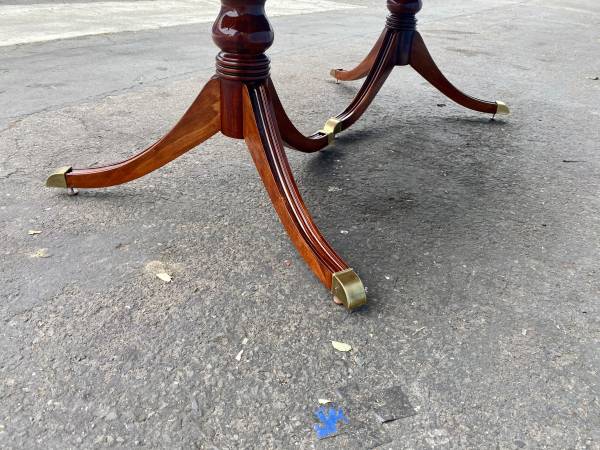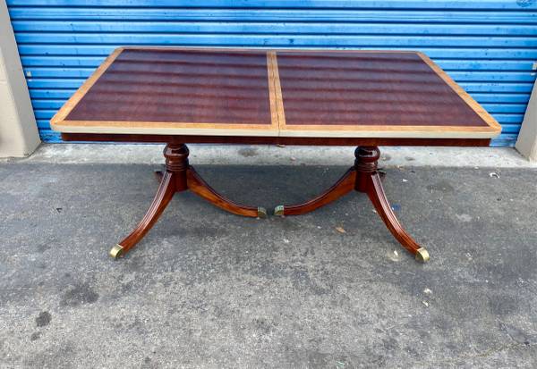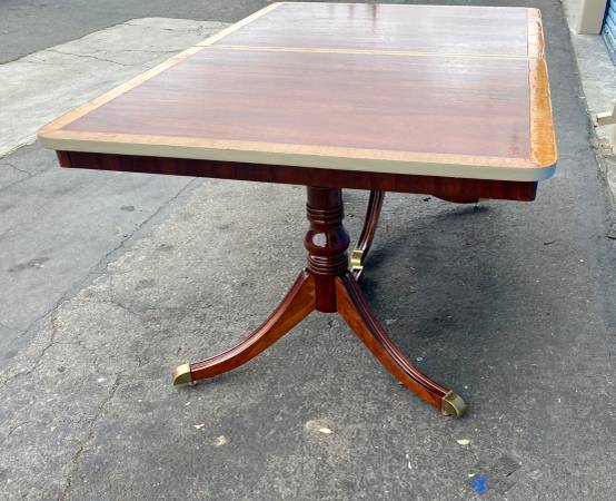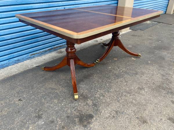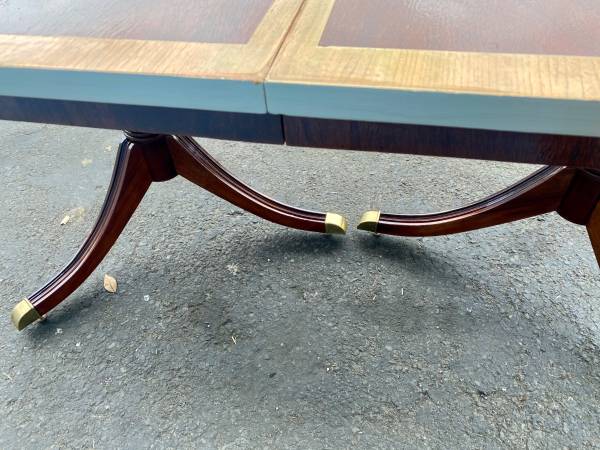 Vintage 1940’s Hollywood Regency style, Mahogany Duncan Phyfe Dining Table, with Golden Mahogany Museum Banding, metallic edge paint, bright brass sabot feet covers and adjustable foot pads.