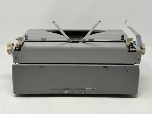 This machine was partially serviced, but still will need a little more TLC to make it really shine. The right ribbon spool is sticky, which makes the ribbon too taught when traveling from right to left. The tab set lever in the back broke off and so the tabs will not work on this machine. Also the little button the side of the right platen knob is gone.