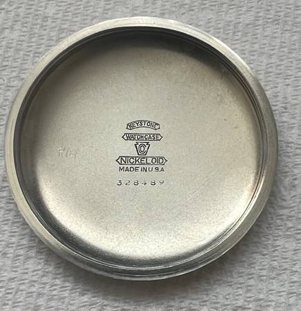 White dial with Arabic numerals. On the movement is engraved, Patent Pinion, Dueber Canton, Ohio, 16 Jewels. Movement Serial Number: 872604 This pocket watch is size 18, model 2, Grade: Dueber, it has 16 Jewels, Inside the case is engraved, Keystone, Watch Case Nickeloid Made in USA #328489.