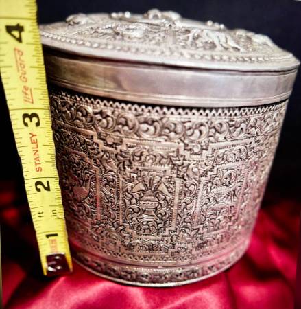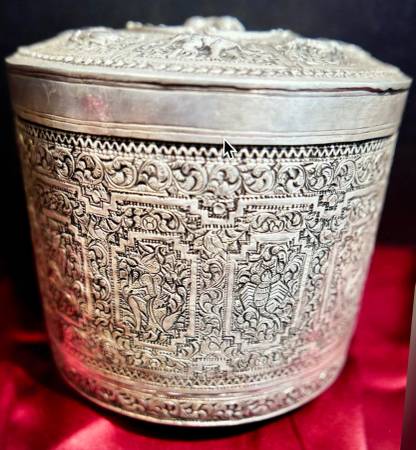 Lovely antique repousse silver betel nut box acquired during a journey through Shan State, Burma(Myanmar) late last century. Handmade. 4.5"H x 4"W