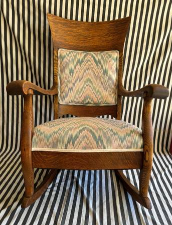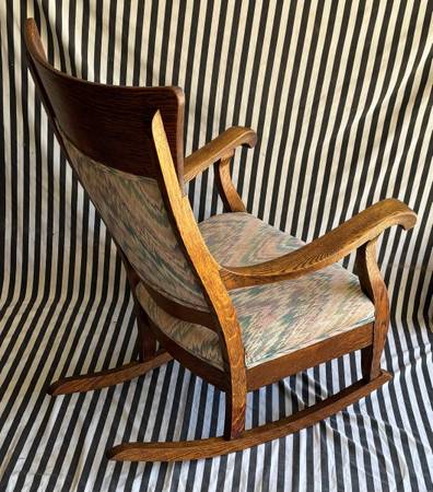 This 19th century rocking chair with a sprung cushion seat and quarter sawn oak body is in near perfect condition. It has a graceful form; in profile, the legs, arms and over-arching back suggests a swan. And a sprung seat for a soft landing.. And gorgeous ‘Tiger’ oak grain from ‘old growth’ forests to delight your eyes.