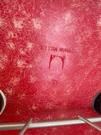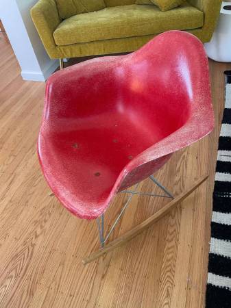 Authentic Eames armchair shell with Modernica rocker base. Has Herman Miller stamp. Perforations on the seat suggest it originally had a built-in cushion. Beautiful patina.