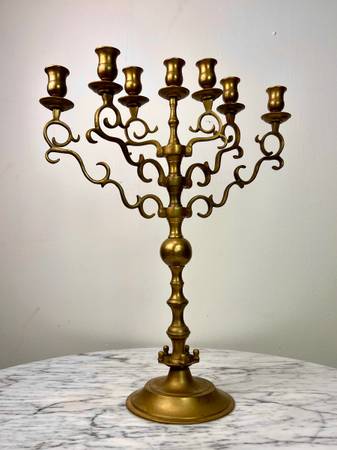 Just in time for the holidays, this antique synagogue menorah can double as a candelabra to light up the room for any season! The rotating scrolled arms can be arranged however you’d like, and the drip pans under each cup will catch all the wax drips. The deep patina gives a darker tone and a great aged look, but you could also polish it up to be shiny and new looking if you’d like.
