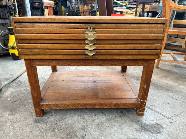 Antique quarter sawn oak table. Beautiful rich tone to the wood. Rare map file from train stations to figure out where you’re going. It’s a wonderful size for a coffee table or side table. $700.