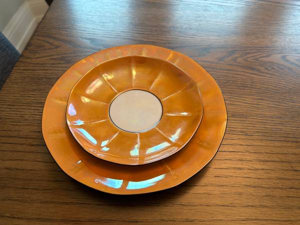 A truly spectacular, great vintage condition for 6; all luncheon plates, tea saucers, and tea cups are intact. Gorgeous iridescent peach luster, with a rich salmon meets pumpkin orange hue underneath. Best guess is mid-century Czechoslovakia. The absolutely best Autumn tea set available for all of your parties and photo shoots. Teapot and cups are sound and ready to use.