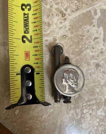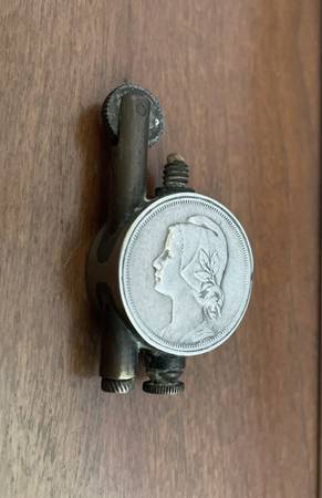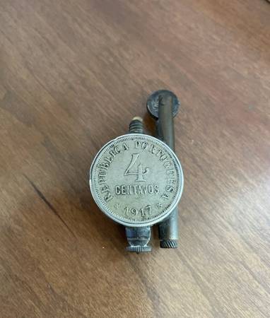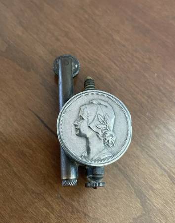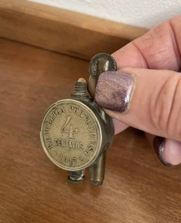Very rare unique 1917 Trench Art Lighter handmade of 4 Centavos Portugal Liberty made in the trenches during WW1. Someone paying homage to the lady liberty by keeping the front of the coin shined, the back of coin is tarnished. The wick is still visible. Very cool unique and rare piece of history. Selling parents estate items, click on MORE ADS BY THIS USER.