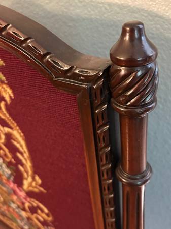 A beautiful free-standing fireplace screen featuring intricate, hand-stitched needlepoint work set within a richly carved dark wood frame.