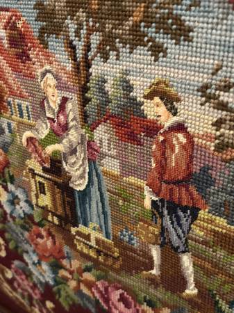 Design: The needlepoint panel displays a charming pastoral or figural scene, encircled by vibrant floral and scroll motifs on a deep burgundy background. The frame exhibits classic design elements and detailed carvings on the posts and feet
