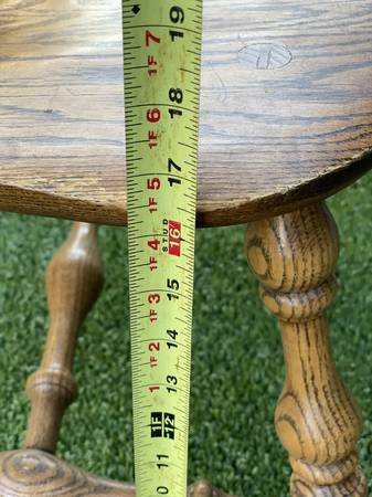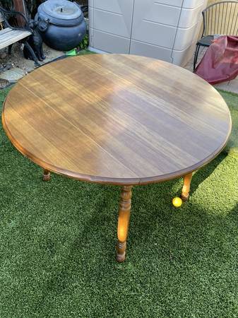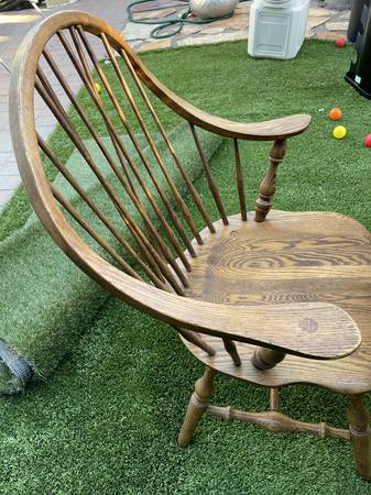 The set consist of 4 solid oak Windsor chairs, 2 are arm chairs. They are in good condition. The table is a Vintage Cal Shops Maple Drop Leaf Table with 2 leaf extensions. Some of the pictures show...