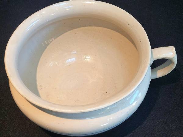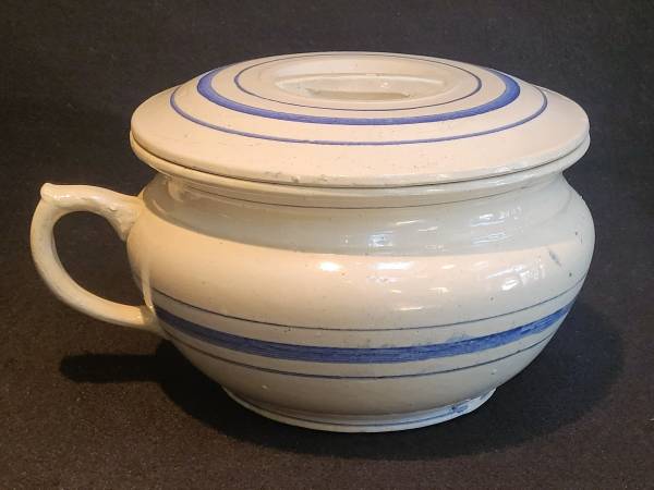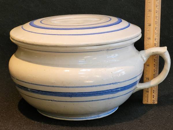 Red Wing and antique collectors, here's a rare find! A wonderful large rustic Red Wing Blue Banded Chamber Pot… and the Cover! Made in Minnesota from the turn of the century, it is in remarkable condition with only the normal stoneware imperfections, no cracks or chips, only a shrink line by the handle. The chamber pot is bright and shiny and will display very well. It measures 9 1/2 inches wide by 7 inches tall with the cover.