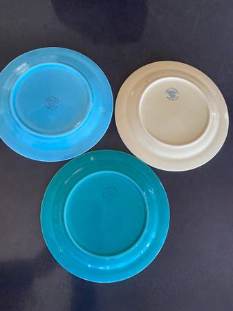 6 - 7 3/4 inch pastel plates (not "Bauer") included are 3 "Early California (Vernon Kilns)" and 3 "Pacific"