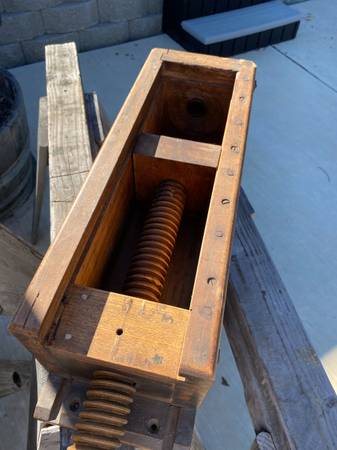 Early wooden1800’s sausage stuffing press were simple hand -cranked. All oak construction.