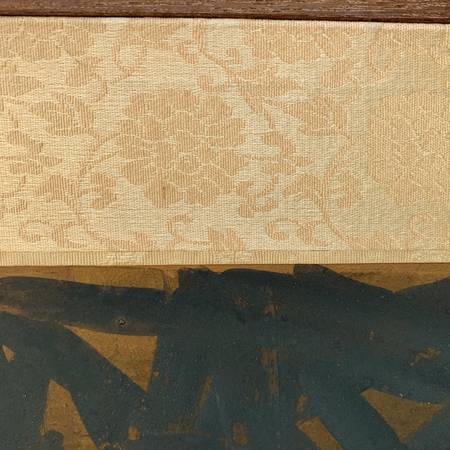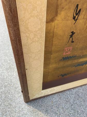 4 panel Japanese screen from the Showa era. Screen features 7 elegant ladies in a bamboo grove. Hand-painted on gold leaf. Signed lower left and mounted with gold brocade silk. Measures 47 1/2 inches high by 71 inches across. It is 3/4 inch deep. Excellent condition with little to no fading of the color. Slight tear in the rear of one screen with slight water stain also on a back panel. Front panels are in excellent condition. $475.00 or best offer.