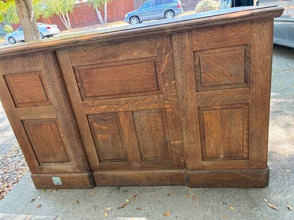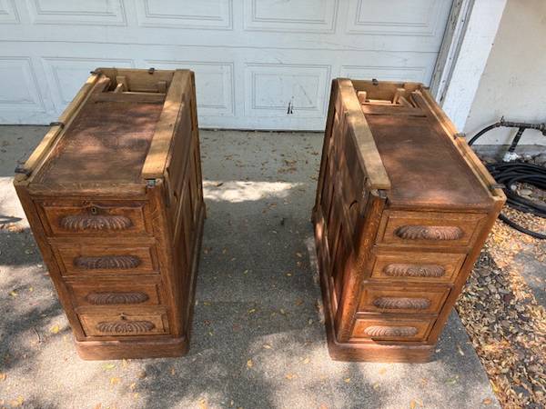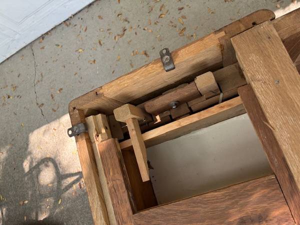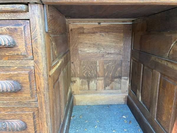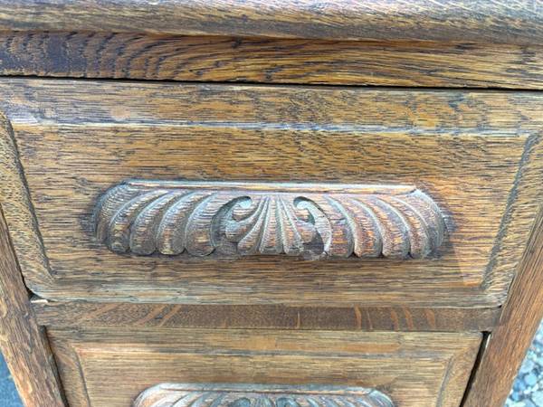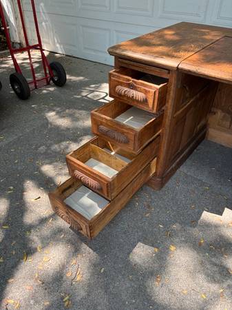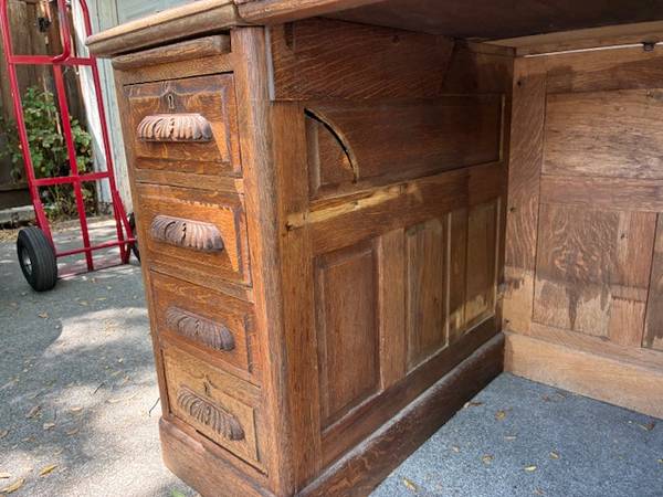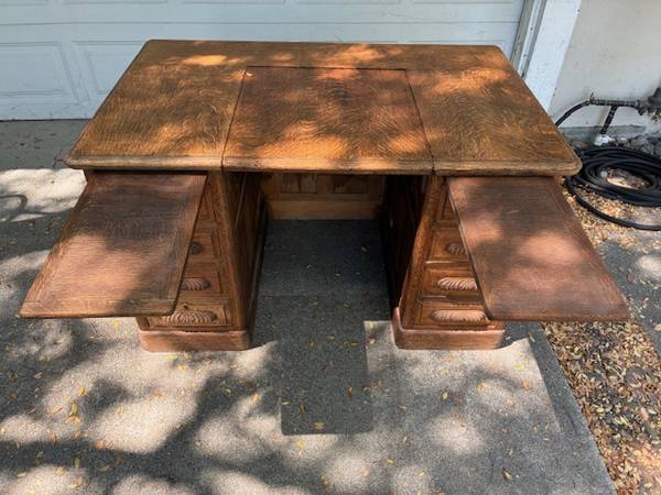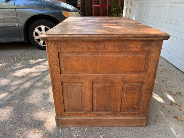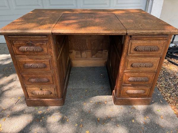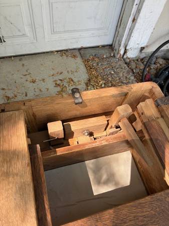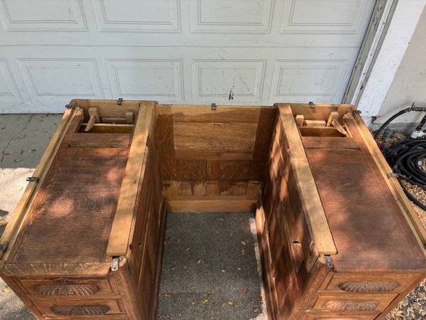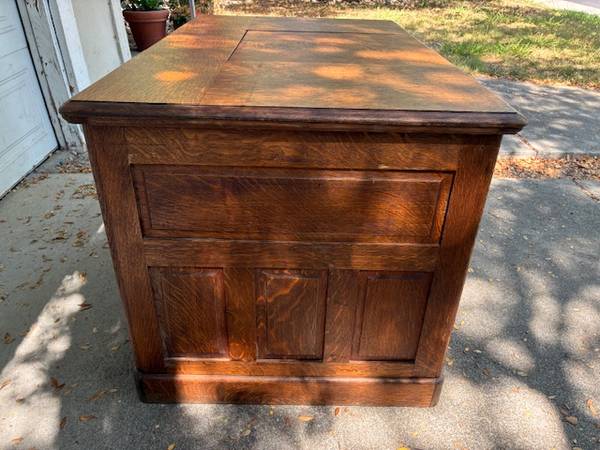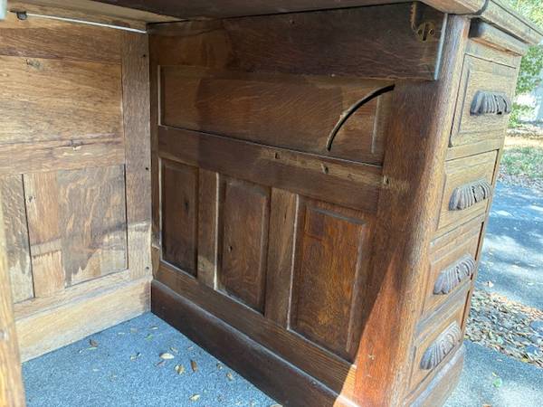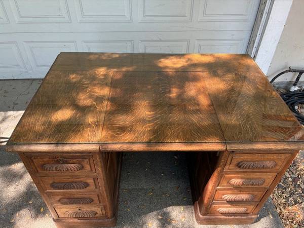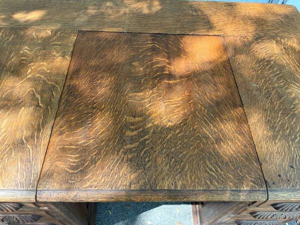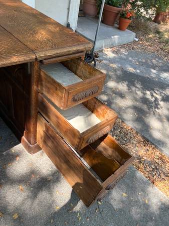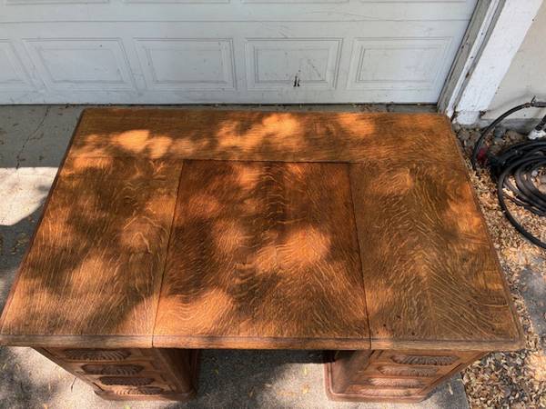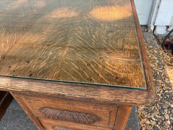 Beautiful Quarter Sawn Oak Desk. I believe this was just before the Craftsman period, but someone may know better than me. That would put it early 1900's. Was originally a typewriter desk (mechanism missing). More legroom without the typewriter hardware anyhow. It is a beautiful piece! It is finished on ALL sides. Measures 50" wide, 32" deep, 30" tall. On any of these, the cut out for the typewriter makes it a bit uneven, so we had a piece of glass made for it. Protects it, and makes it fully functional! It was taken apart and I can't find the screws for the top, but shouldn't be hard to find a few that work in that old jar in the back of the garage cabinet. Easy to transport the way it is. It has a really elaborate locking mechanism in the drawers as well, I tried to capture that in the photos. I have no idea if it was ever refinished, if it was, it was a long time ago. We have really enjoyed this piece for the last 20+ years, we just don't have room for it anymore. It needs a good new home. $80
