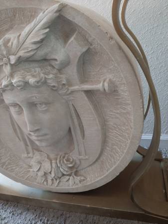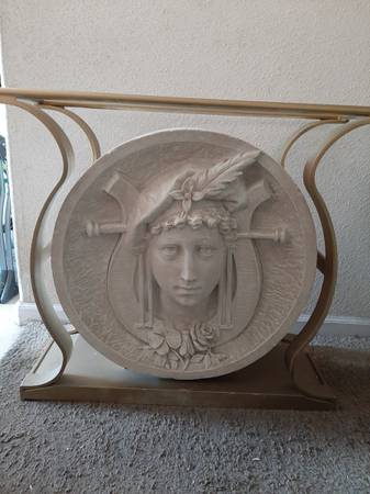 Hello, we have this fine beautiful carved plaster sculpture circa table. The sculpture bust of the Greek goddess Athena, also known as Minerva in Roman mythology from early 19th century measuring 24 inches. This is a very rare find. Nice condition, it has a very thick and heavy glass measuring 54 inches long by 18 inches wide metal frame gold color which needs a little touch up, total high 30 inches. Beautiful table that will make a great looking hallway. Asking price $13,500.00 Thank you for checking.