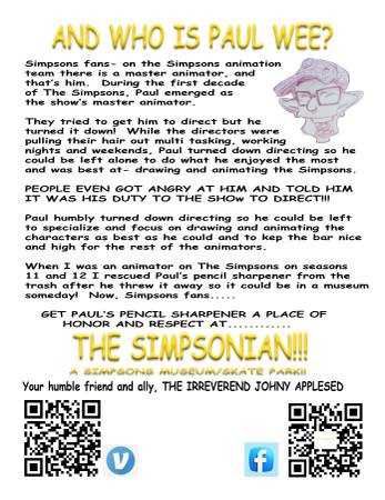 One day I was standing at the supply cabinet, getting paper and pencils and Paul walks up next to me with his pencil sharpener, wraps the electric cord around it and lays it down on a pile of crap to be thrown out; broken lamps and stuff. P Wee was written on it and I said to myself "That thing HAS to be in a museum someday!" So, after 25 years......I'M SICK AND TIRED OF HAVING PAUL WEE'S PENCIL SHARPENER IN MY GARAGE!!! So I've designed a t shirt to promote a Simpsons museum. On the front it say's "Get Paul Wee's Pencil Sharpener a Place of Honor and Respect in a Simpsons Museum!!!" On the back is a description of Paul, the top Simpsons master animator who turned down directing and promotion to be left alone to draw the characters as best he could. Paul's pencil sharpener needs a place at.............THE SIMPSONIAN!!! LOOKING FOR A T SHIRT SALES PERSON!!! I'm getting set up on Etsy, Shopify and Amazon. I look forward to hearing from you!!!