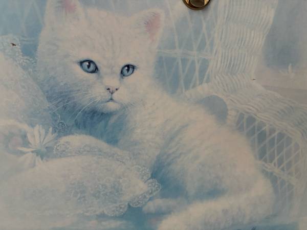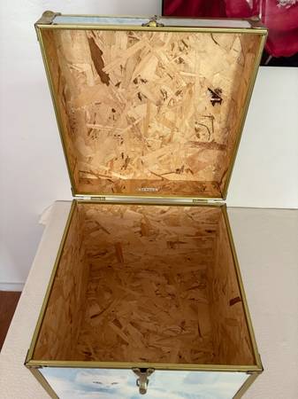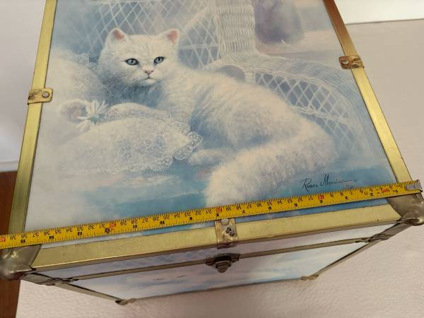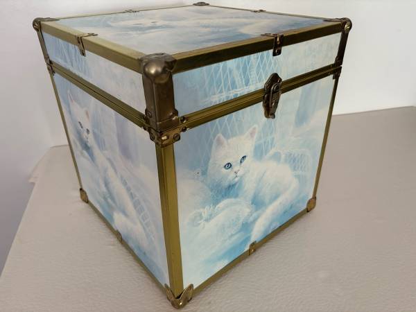 RUANE MANNING White Kitty Kitten Cat with Blue Eyes Wooden Trunk Chest Toy Storage Box 16" Cube Vintage Measures 16”x16”x16” in good condition. Stuffed Animal Doll storage. Seward pressed plywood....