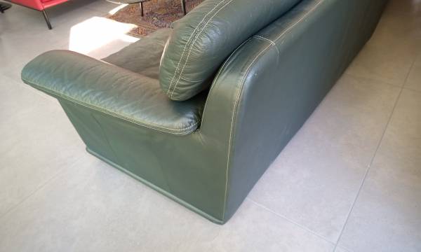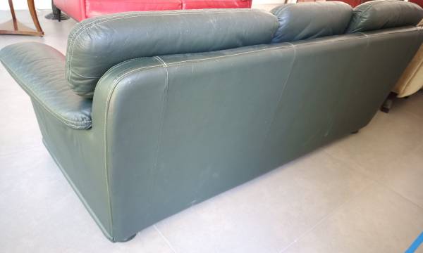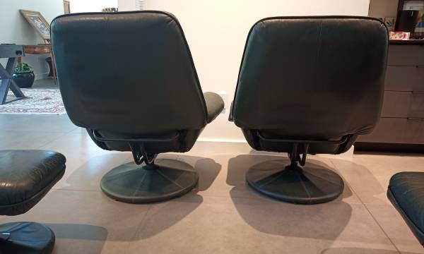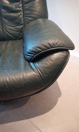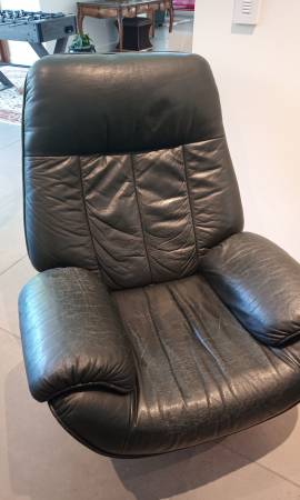Comfortable leather couch. Back cushions and seat cushions stuffed with down. 2x matching leather recliners. Recliner swivels 360 degrees. 2x matching ottomans. Couch dimensions (approximate) - 80"...