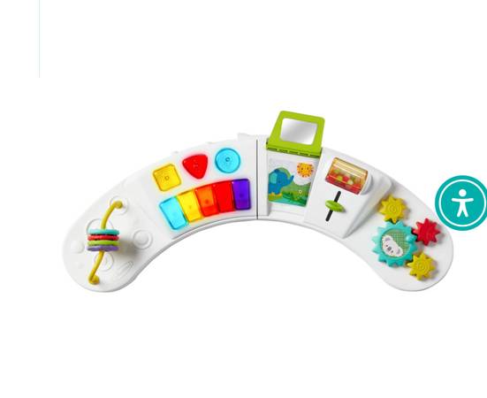 SNACK TRAY HIDDEN UNDER THE TOYS: Slide the toy pods apart to reveal a snack tray with a built-in cup holder — perfect for easy transitions from play to feeding without needing to move baby or change seats