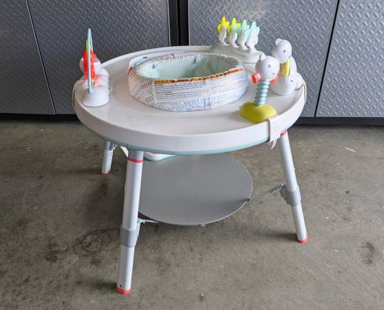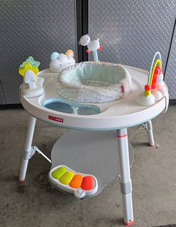 For little ones, the center seat rotates 360 degrees so your baby can bounce and spin to their heart’s content. They can also reach the four interactive toys: peekaboo clouds that pop up and squeak, a wobbly lamb with rattle beads, swaying stars and a sun bead mover. You can reposition toys to suit your baby’s needs, and toy loops on the seat allow you to easily add more. The activity center also comes with a bird snack bowl that suctions to the surface.