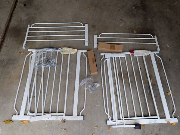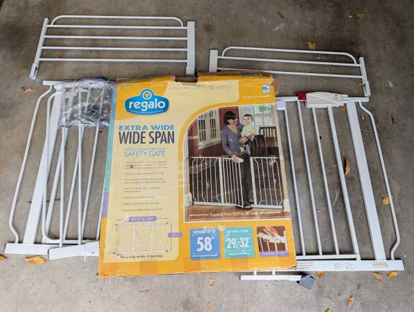 Expands from 29.5" to 32" and includes extensions to span openings of 58" wide. This is 2 sets, but some of the pieces are missing. Might only be enough to make one gate. Pick up as is.