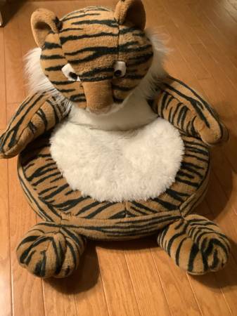 The Tiger Chair is a cuddly companion for reading, relaxing and snuggling thanks to its perfect size, soft plush "fur" and contoured support. Chair measures 21 in x 19 in x 19 in and is suitable for most children. Please use parental caution and supervision. Chair is intended for children 12 months and older. For safe use, child must be able to sit unassisted and his/her feet should be able to touch the ground while sitting on the seat of the chair.