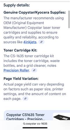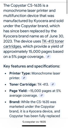 Copystar CS-1635 All in One Printer - Laser Printer/Copier Excellent condition Very Low Use Purchased in 2015, but been in storage since 2018 Supplies still available Black and White
