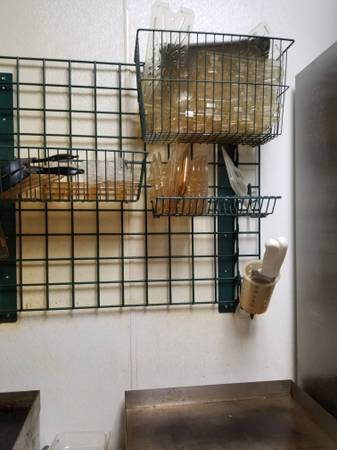 Used Commercial Kitchen Green Wall Rack System. To hang Utensil & other items on. -1- Wall Grids -2- Rack wall mounts -5- Basket Items Good Condition Sold As Is Condition No Return Look in junk...