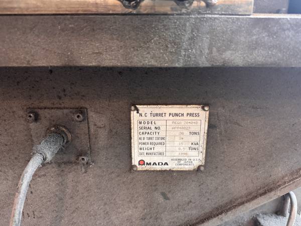 Used 1998 Amada Pega 244 CNC Turret Punch Press: Specifications: Press capacity: 22 Tons (20 Tons Metric) Max. Sheet Size (with repositioning): 40" x 80" Max. Sheet Thickness: 0.25" Max. Sheet...