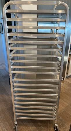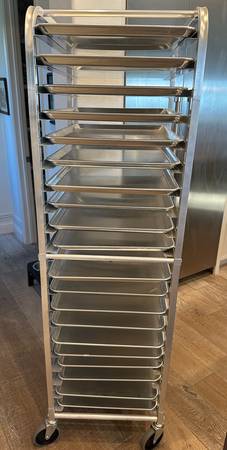 We have two baker's racks / sliding sheet pan racks that we are no longer using. Pictures are of one cart, but they are identical. Each of these is 6 feet tall and holds 20 full size trays. 20 full...