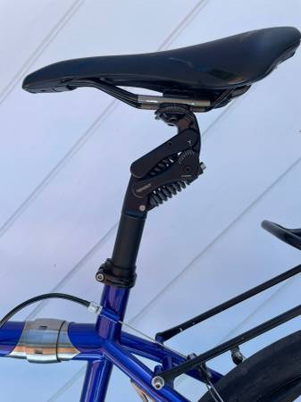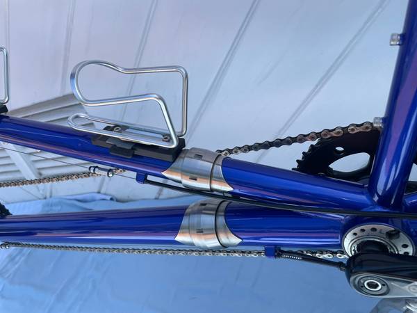 The blue painted frame is a real eye catcher that sparkles in the sunlight. The paint is fully intact with no significant scratches. The frame shows a few minor scuffs, primarily on the captain’s top tube, and two small dings with no paint loss. (Close-up photos available.)