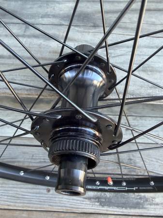 The Arch D rim has 26.0 mm internal width / ~29.3 mm external width for the 29″ version. The hubs are center lock for Shimano. They came on my Kona Libre DL back in 2020 or 2019. They are in absolutely excellent condition. You can hardly tell they were ever even ridden on. They are 12mm x 100mm Front and 12mm x 142mm Rear. Wait on the front wheel is 960 g rear wheel 1195 g.