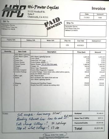 The black lightning is built by high-powered cycles in California, featuring the thunderbolt, 4000 W motor. It has enough power to climb almost anything. It has a springer seat post and padded seat for great comfort. Braking is do by Magura four pistons hydraulic calipers for with with 203 cm rotors and a three speed control switch which allows you to tame acceleration. The bike weighs 60 pounds and has a large frame. I paid $5838 custom built and I average around 30 miles per charge. It’s a great bike in excellent condition, so if you’re interested, please give me a call for a test drive.