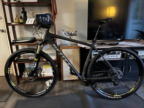 Scott Scale 920 Hard Tail Carbon Mountain Bike with Sram 1x11 Speed Components, Syncros XR25 Alloy Wheels, Fox Float Fork with remote lock out and 100mm of travel, Rock Shox Reverb Dropper seat post, and SRAM Guide RS Hydraulic Disc Brakes. Size: XL