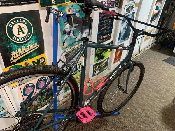 Selling my 58cm Surly Cross-Check set up as a flat-as bar commuter/gravel build. It has an 11-speed Shimano XTR rear derailleur with a wide cassette, pink Deathgrips, pink Race Face pedals, and gravel tires that roll fast but grip great. The bike shifts smooth, rides solid, and is super versatile—perfect for city riding, trails, or all-around use. Frame is in great shape and everything is dialed in and ready to go.