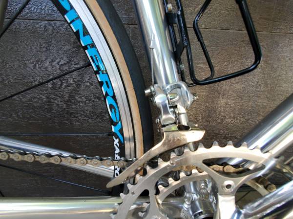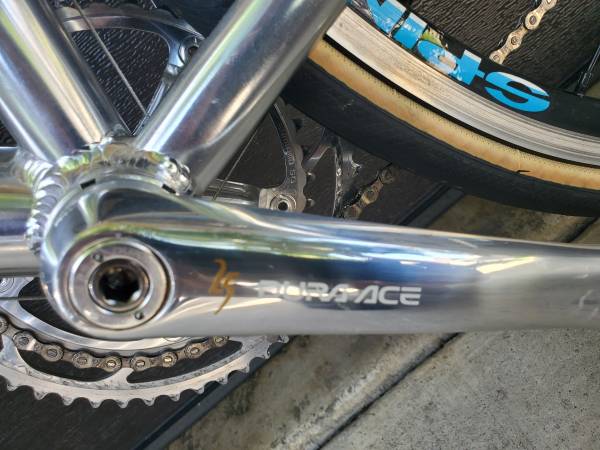 road bike is unpainted with polished aluminum tubes and is a perfect vehicle to display the 25th Anniversary Shimano Dura Ace