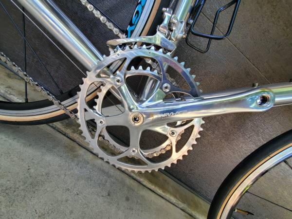 with no dents or paint chips since there is no paint. The frame measures 52 cm seat tube and 56 cm top tube center to center.