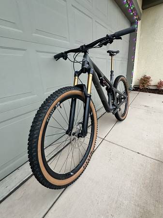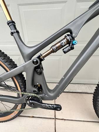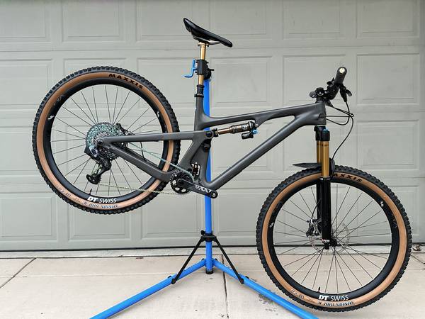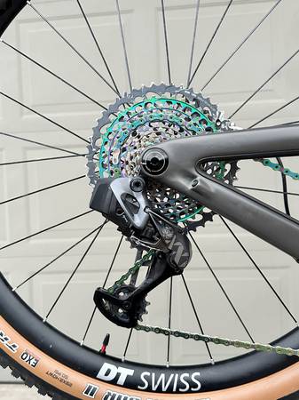This is the premium T1 build of the Yeti SB130, equipped with SRAM XX1 Eagle, including the signature oil-slick XX1 AXS cassette, and top-of-the-line components throughout. The bike features Yeti’s high-grade TURQ carbon frame, Factory-level FOX suspension, and DT Swiss hubs laced to EX1700 series carbon wheels. The bike saw three seasons of regular use with normal cosmetic wear, then sat unused after I upgraded to a new ride. I relied on a tailgate pad to transport the bike and it rubbed the paint off on the down tube as seen in the last photo.