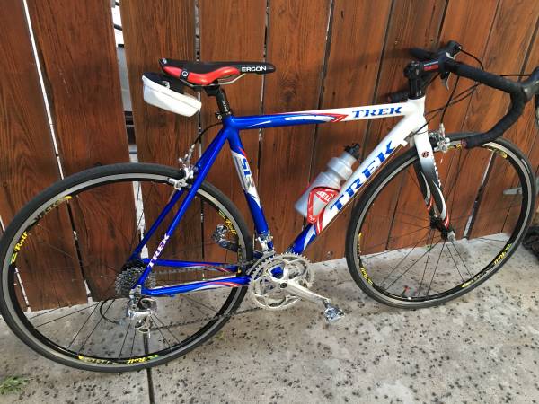 TREK SLR, road bike 54cm medium, blue, white, red, Ultegra drivetrain, aluminum frame, upgraded wheels and new tires, new Ergon leather seat, clipless pedals, water bottle and cage, excellent condition, made in USA ๐บ๐ธ $995