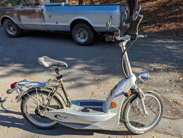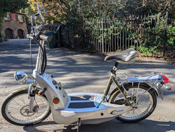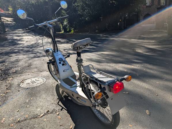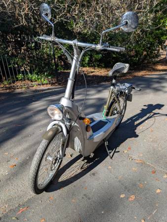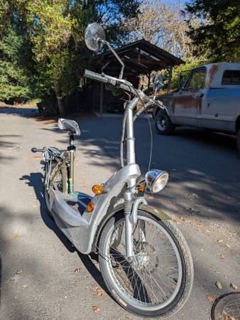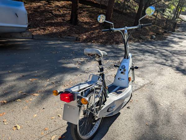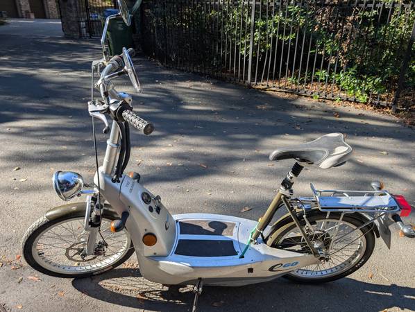 US made. 24 mph top speed and up to a 20 mile range. Scooter has two modes, "go fast" and "go far". It is powered by a 24 volt motor from two 12 volt 35 amp hour SLA batteries. Batteries were replaced one week ago. It has a headlight, tail light, brake light, turn signals and horn. Front disc brakes and rear cantilever brakes. Regenerative braking charges the battery and acts as a brake. No license or registration is required, just a bicycle helmet. It has a step-through frame made from aircraft grade aluminum. 20 inch wheels and a new rear tire. Front forks and a pogo seat. A battery charger is included that will charge SLA, and Lithium batteries at 12 or 24 volts. I rode it back and forth to work for several years before retiring and it was very dependable. Please call or text Chris for any questions or to come and take a look at it. 925 three two four seven 496