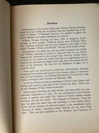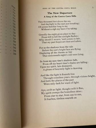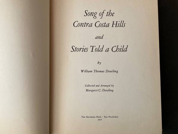Thank you for viewing this odor-free hardback book entitled Song of the Contra Costa Hills and Stories Told a Child by William Thomas Dowling, collected and arranged by Margaret C. Dowling; published in 1937 by The Recorder Press of San Francisco. This First Edition (the publication year 1937 is printed on both the title and copyright pages with no subsequent dates or printings noted) is in very good condition. No dust jacket, but presumed not to have been issued with one. William (1829-1907) wrote the poems contained within and his daughter published the collection.