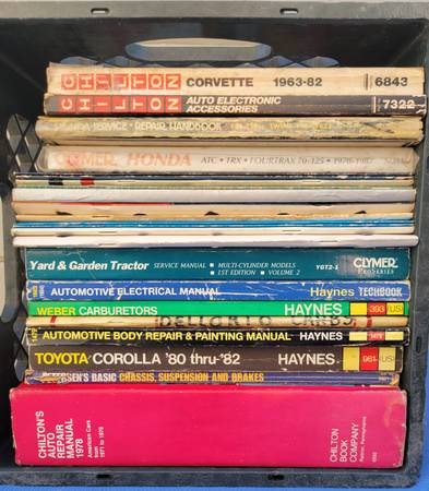 Crate FULL of automotive, motorcycle, yard/garden equipment manuals. INCREDIBLE deal! Text or Call now. CASH, $40 OBO for all.