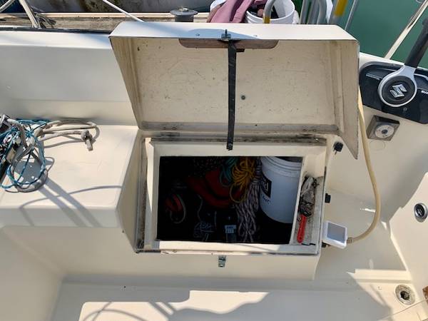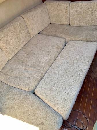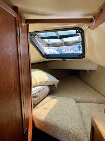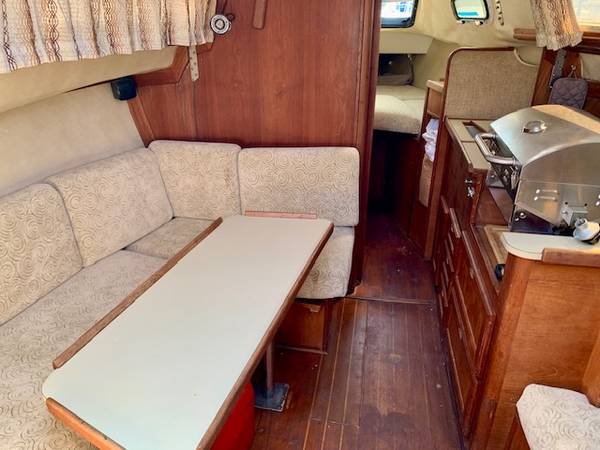 Below deck she is equipped with plenty of storage, PFDs, VHF radio, head (marine toilet), sink, BBQ with table stand that can be mounted outside, sectional couch area with table that folds down to make a large bed, a V-berth bed, forward hatch and portlights for adjustable light and airflow.