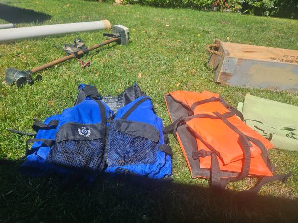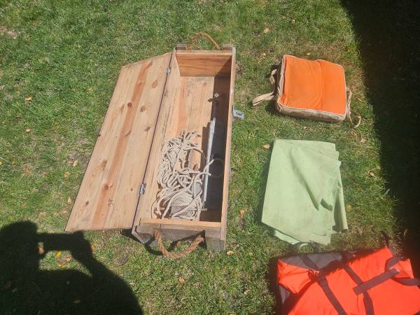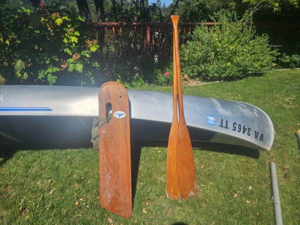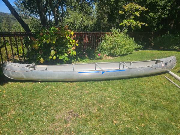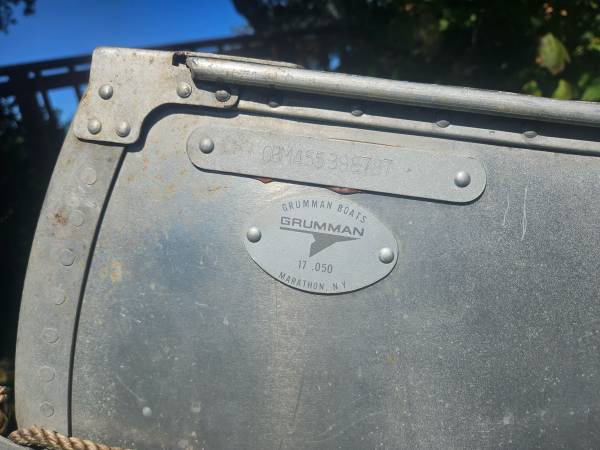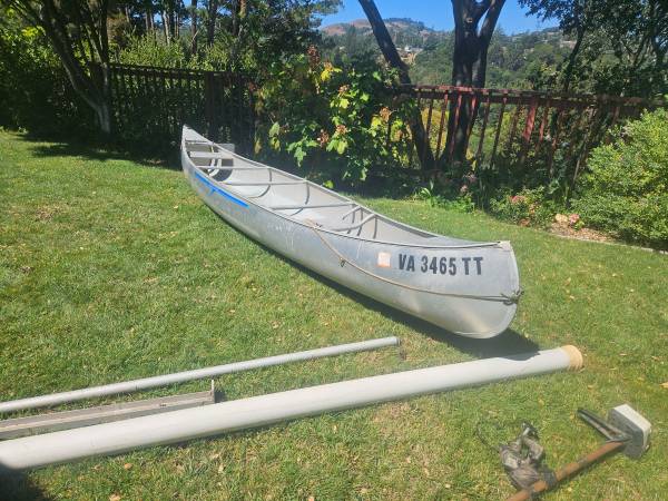Classic 17 Foot Grumman Canoe (aluminum) with Complete Sailing Kit, sturdy wood crate containing anchor, rope, 2 life jackets, 2 original light weight wood paddles, electric trolling motor (I believe it still works but don't have a battery to test it, it worked last time we tried it a couple years ago and it's been stored indoors).