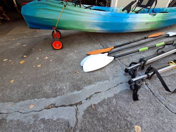 Perception Tribe 13.5 kayak. Great condition. Includes 3 paddles, several life jackets,two wheel scupper cart for moving on land, waterproof pack cover,fishing rod holder, roof rack used with my Tacoma pickup...may or may not work on your vehicle. Asking $600 or BO. Cash only, no trades. You pickup in Pleasant Hill. I don't answer any calls...text through CL