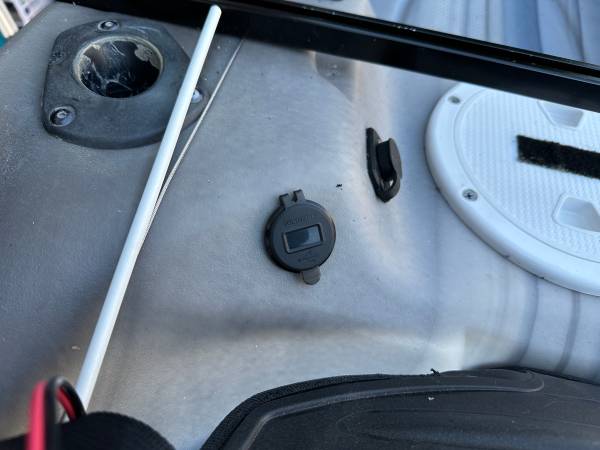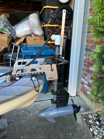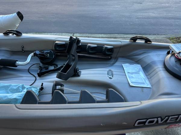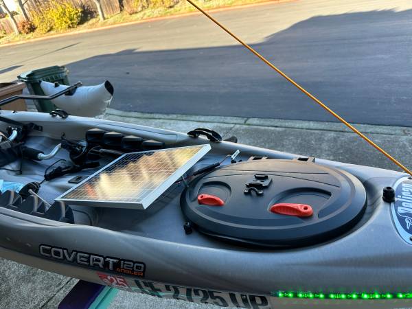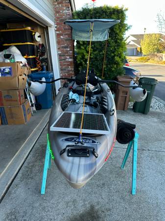 Equipped with 55lb thrust electric trolling motor with quick release Newport Vessels motor mount. Steering by foot pedals. Variable speed control with reverse/forward switch and safety motor kill switch/lanyard. Safety flag (removable) pole with white led on top. Access hatches - 1 large, 1 medium and 1 small. Like new 12v AGM (not Pictured) battery. 15 Watt Solar panel w/charge controller. Power access port 12v 10 Amp behind seat. 12vVoltmeter w/USB charge ports behind seat. Crate type storage bin for gear included sits/secures behind seat. Canopy for sun protection. Scotty anchor mount. Center fishing pole holder in front of seat with 2 holders near seat area. Fish finder mount installed. Multiple fastening/tie down devices. Paddle and mounts with lanyard. Stabilizing pontoons. Port/Starboard Bow lighting with Stern white lighting on sides of motor mount and flag pole. Registered with Quagga mussel sticker. Sole owner.