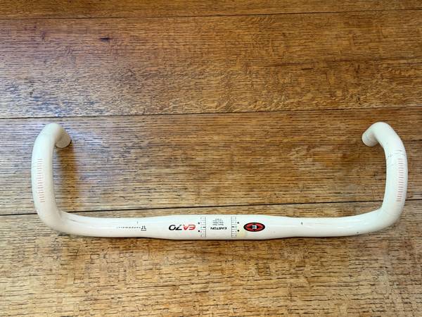 Easton EA70 white handlebars aluminium 31.8mm clamp 44cm center to center 130mm drop 75mm reach in great condition some tape residue, scuffs