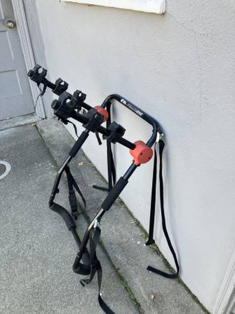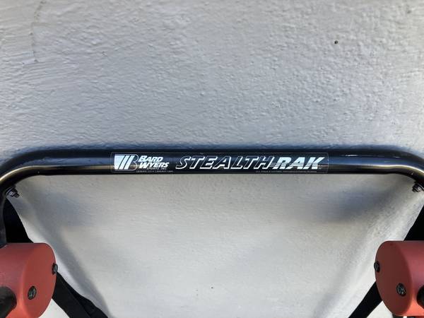 This is a Stealth Rak bicycle carrier made by Bard Wyers Sports Inc. It can hold up to three bikes. It attaches to a vehicle under the bumper and the forward edge of the trunk, or hatchback. The lower end forms a fulcrum which secures the frame to the vehicle.